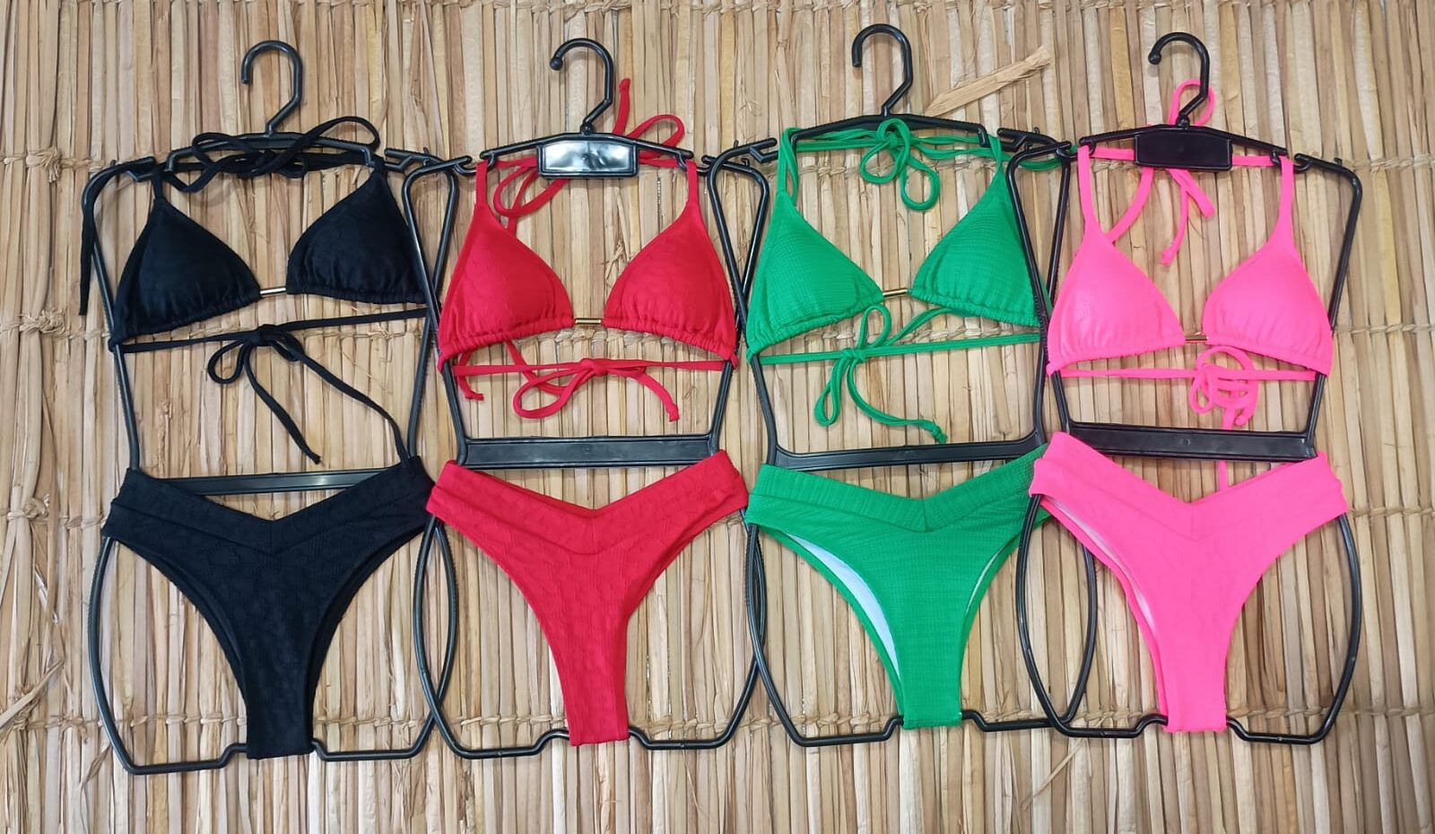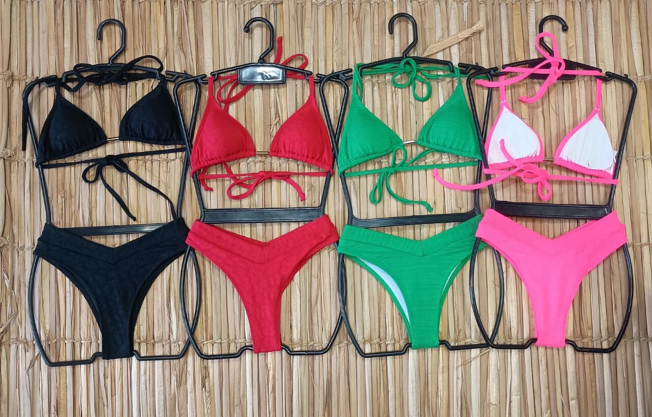 Toque sofisticado e modelagem que valoriza: o Conjunto Biquíni Cortininha Asa Delta em Poliamida Jacard une estilo e conforto para suas melhores ocasiões de praia. Desenvolvido com tecido canelado que modela o corpo, oferece suporte adequado e acabamento com brilho sutil que realça a peça.