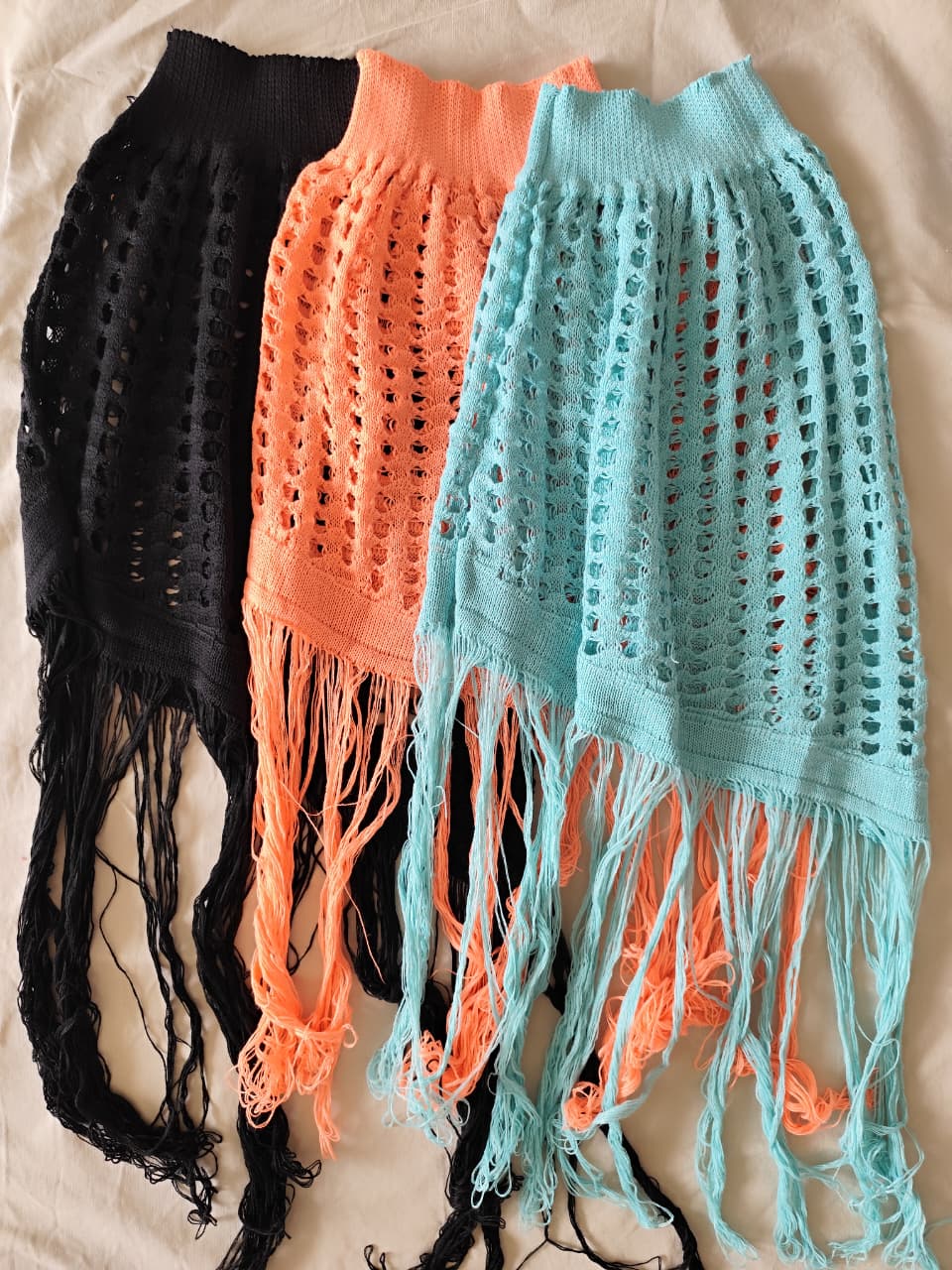 Leveza e charme definem esta saia saída de praia em tricô com franja. Perfeita para complementar seu look de praia ou piscina, o caimento assimétrico e o acabamento rendado valorizam a silhueta sem abrir mão do conforto. Tecido macio e toque agradável garantem versatilidade para usar do litoral ao clube. Design pensado para quem busca estilo e praticidade em um único produto.